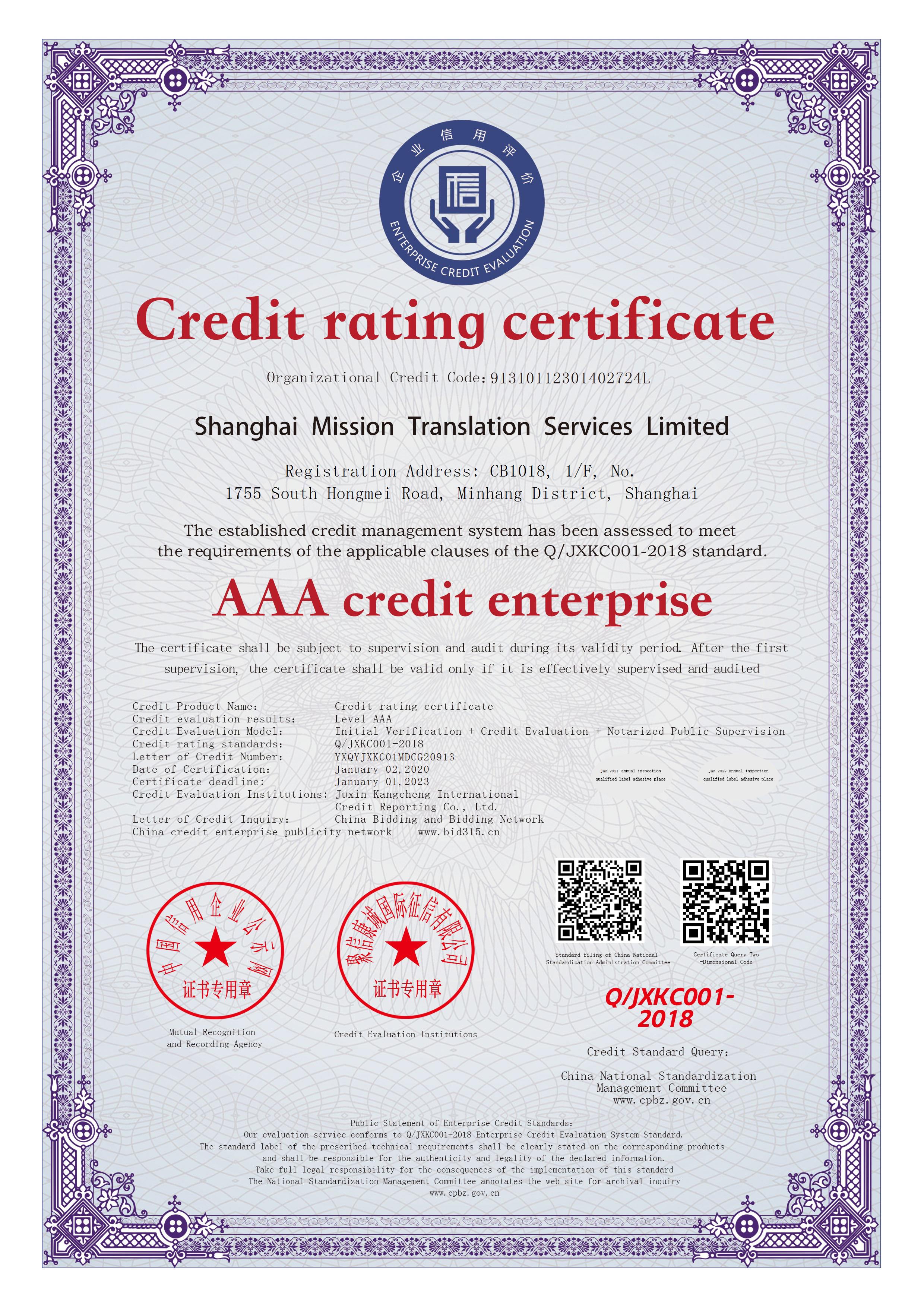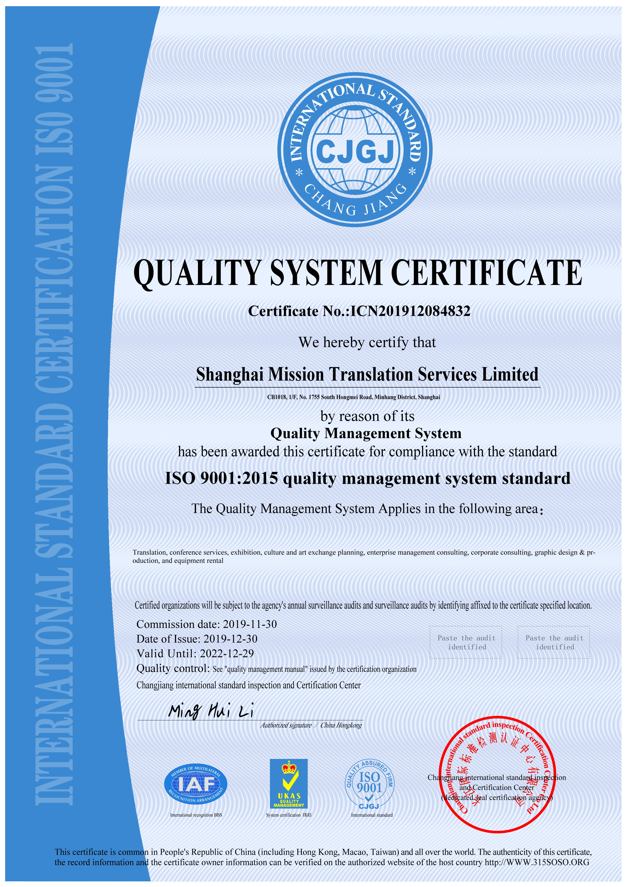 Shanghai Mission Translation Services Limited (a member of Translators Association of China, member of The Association of Language Service Providers, ISO9001 certified and AAA Credit Enterprise certified) is a trustable leading language service provider based in Shanghai. As a translation agency, it always stays professional, honest, efficient and committed to multilingual interpretation and translation. We have established sustainable relationships with government authorities, chambers of commerce, enterprises and public institutions concerning foreign affairs, and many well-known domestic universitie.